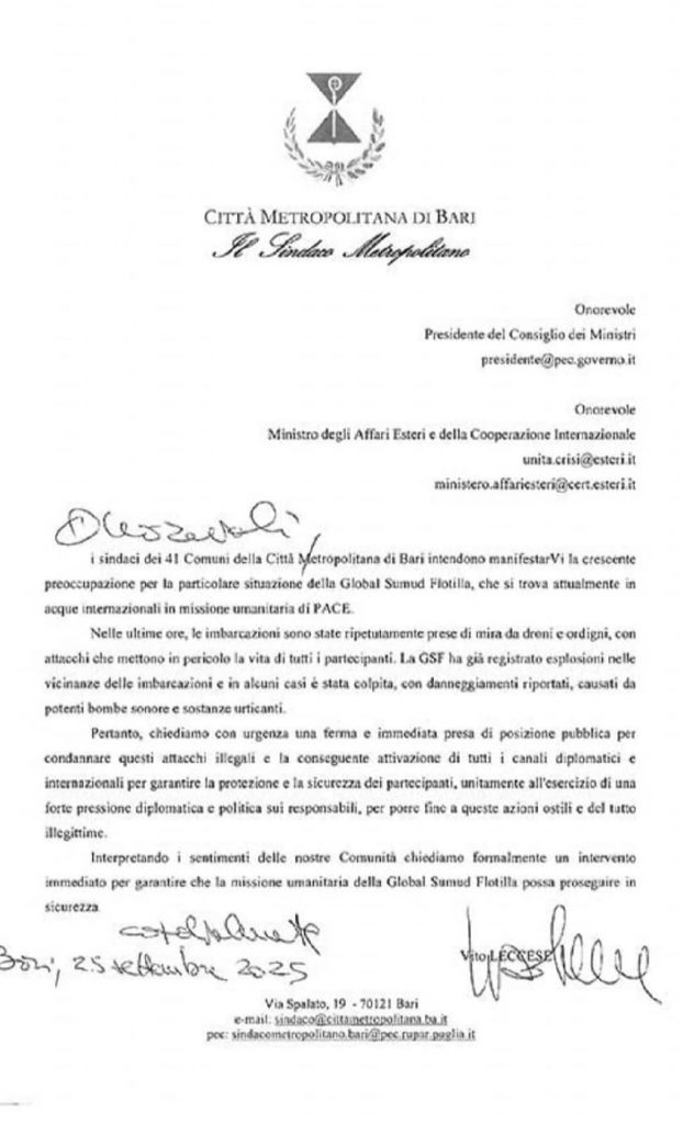 Gioia del Colle chiama a raccolta i cittadini per una causa che attraversa mari e coscienze. Il 25 settembre tutti i quarantuno sindaci della Città Metropolitana di Bari hanno lanciato un appello urgente al Governo italiano e alle istituzioni internazionali, chiedendo di proteggere la Global SUMUD Flotilla, missione pacifica che porta aiuti umanitari alla popolazione palestinese. Le notizie di attacchi contro gli equipaggi scuotono e indignano.